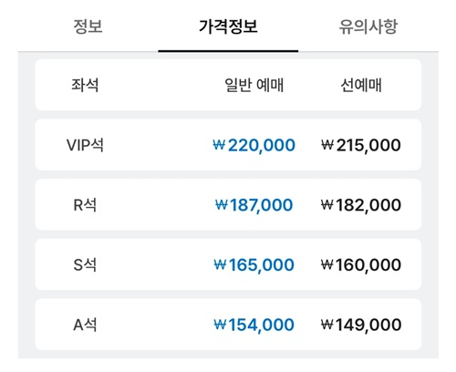 티켓 가격은 좌석등급에 따라 차이가 있으니 참고 바랍니다.